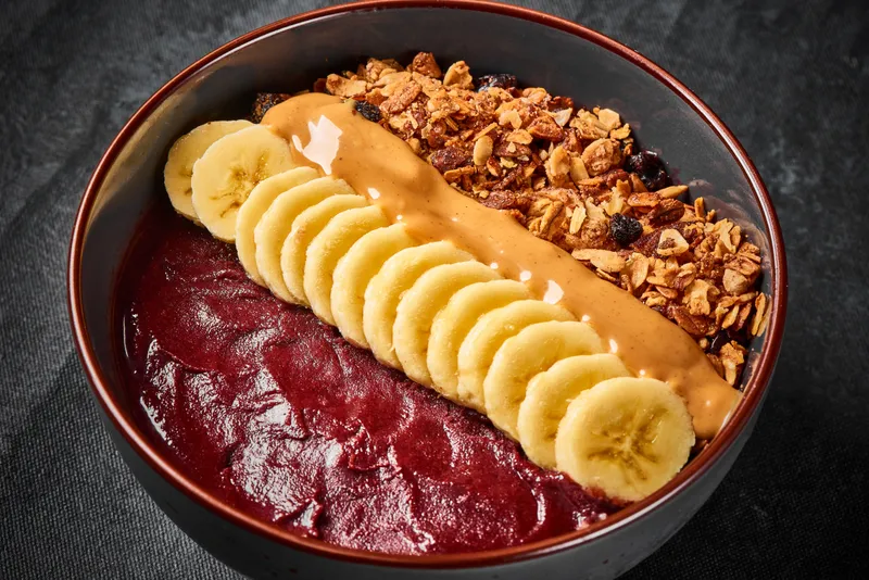 Bowl de yogurt con banano salsa de frutos rojos y granola.