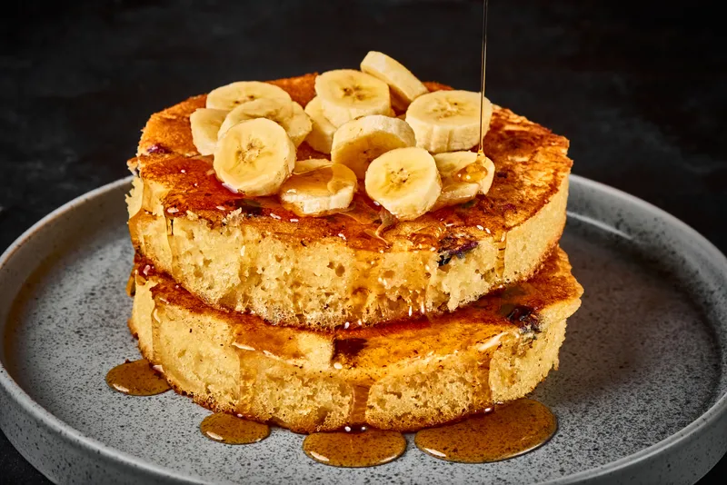 Pancakes tradicionales de harina de trigo con relleno de blueberries tajadas de banano y maple syrup.