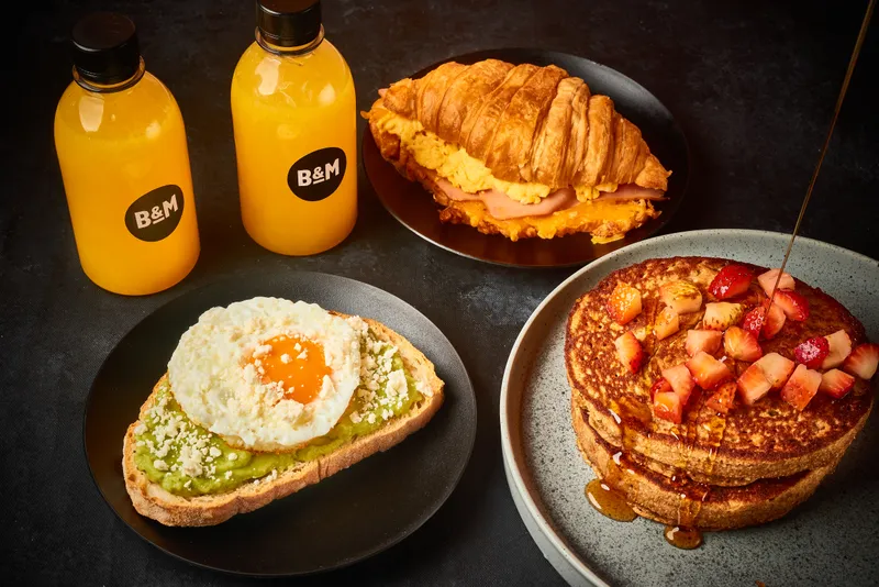 Sandwich de croissant con huevo revuelto jamón y queso.